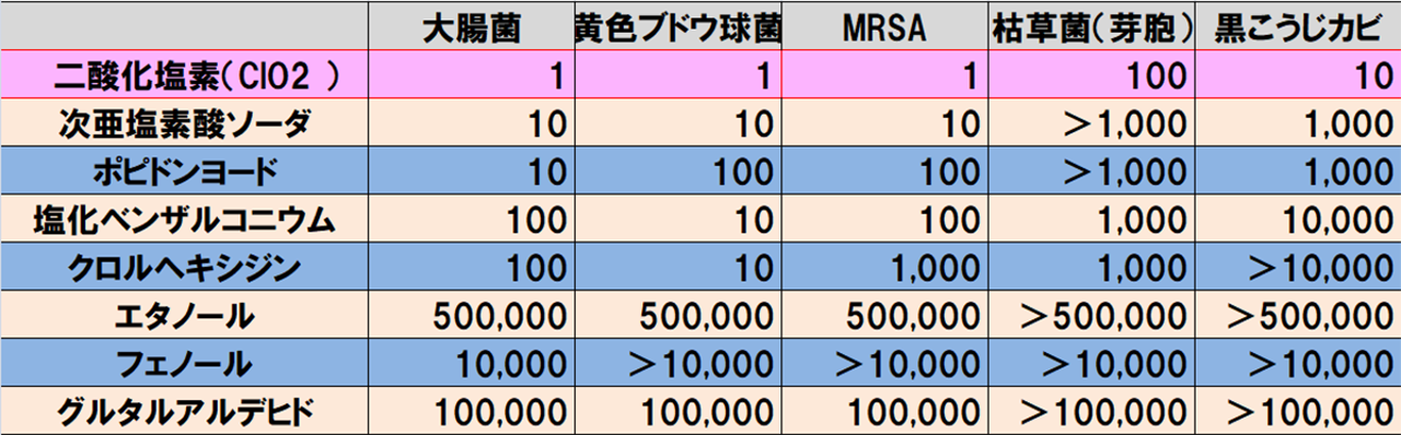 【2.5分後に菌が死滅した濃度(単位:ppm)】